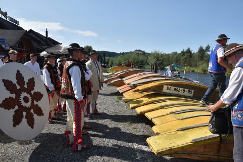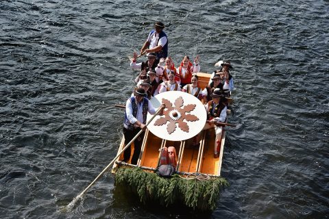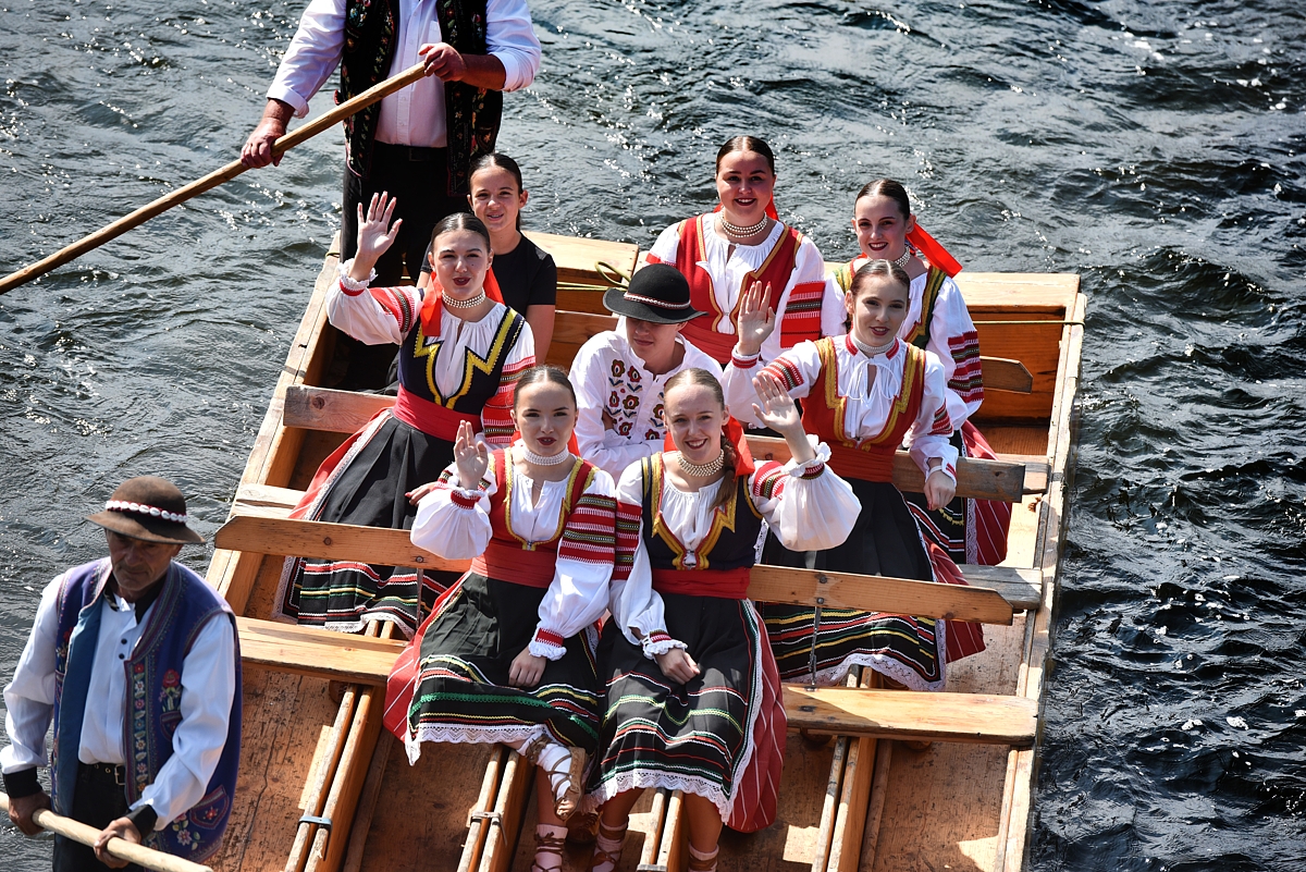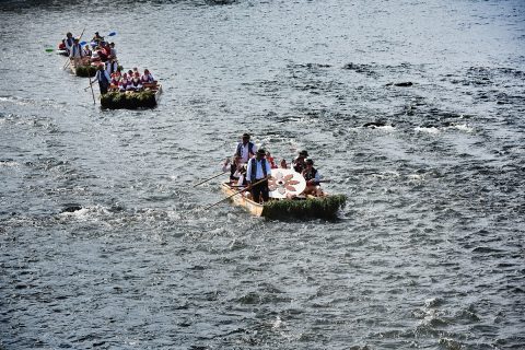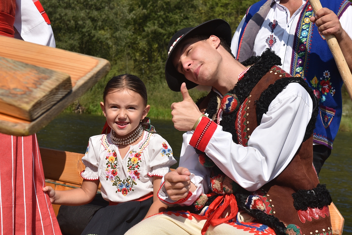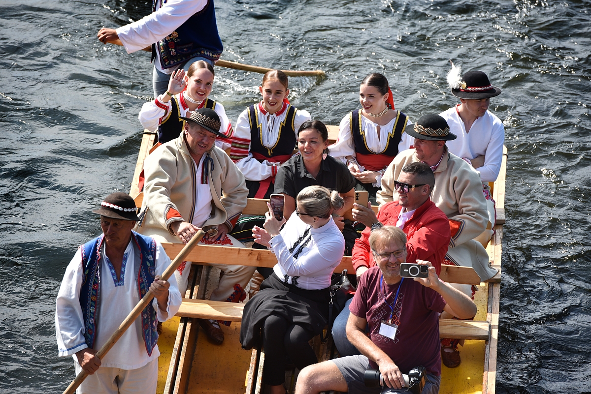 tradičný krojovaný splav členov festivalových folklórnych súborov na pltiach