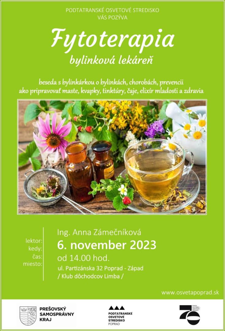 Ing. Anna Zámečníková. Ďakujem Podtatranskému osvetovému stredisku za to ,že zorganizovalo prednášku na tému Fytoterapia, ktorú som mohla prednášať úžasným dámam a pánom z klubu dôchodcov v Poprade na Západe. Na toto nezvyčajné podujatie sa zišli poslucháči v hojnom počte, veľmi aktívne sa zapájali do diskusie a prispeli do nej svojimi vedomosťami a overenou praxou. V prednáške sa poslucháči dozvedeli, ako správne zbierať a spracovať bylinky. Tiež ako pripravovať čajové zmesi, oleje a tinktúry. Počas prednášky si všetci pochutnali na bylinkovom čaji a šípkovom sirupe. Na záver som odpovedala na ich podnetné otázky a dala som im pár užitočných receptov. Oni ma tiež obohatili o svoje skúsenosti s bylinkami ,ktoré sú súčasťou ich života často zdedené po rodičoch. Odchádzala som s dobrým pocitom, že sa oplatí robiť osvetu v oblasti bylinkárstva a vrátiť poznanie a bylinky späť do nášho uponáhľaného a pretechnizovaného života. Teším sa na ďalšie besedy o bylinkách, ktoré pre Vás zorganizuje POS v Poprade.