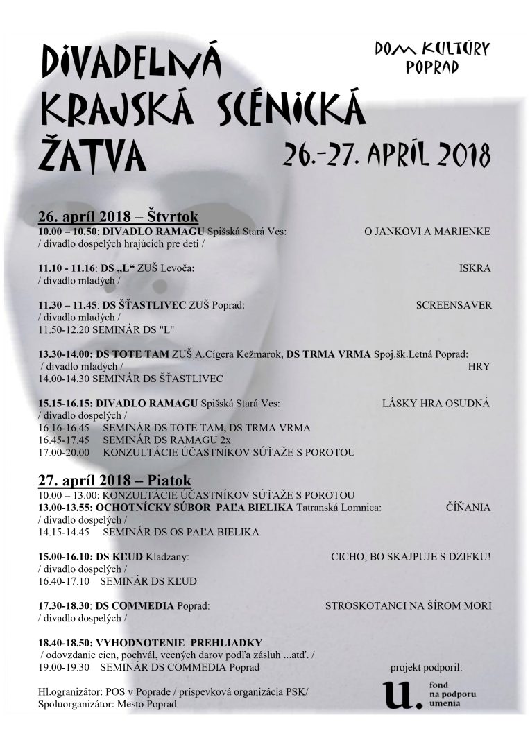 Postupová súťažná prehliadka prebiehala v dňoch 26. – 27. apríla 2018 v Dome kultúry v Poprade. Zúčastnilo sa jej 8 ochotníckych divadelných súborov súťažiacich v troch profilových kategóriách. Súčasťou prehliadky boli rozbory jednotlivých predstavení, ktorých sa zúčastnili nielen členovia aktuálne hodnoteného súboru, ale aj ich kolegovia. Dostatočne dlhý čas vymedzený na rozbor umožnil aj širší dialóg poroty s tvorcami a divákmi. V rovine dramaturgického výberu titulov je pozitívnym konštatovaním výrazné zastúpenie autorských textov (Iskra, Screenserver, Hry, Cicho, bo skajpuje z dzifku), ktoré tematicky reagovali na aktuálne spoločensko-politické problémy, druhovo a inscenačne rôznorodo interpretovaných. Prehliadka prebiehala bez akýchkoľvek technických kolízií a opäť s konštatovaním potreby, resp. možnosti súborov sledovať si vzájomne svoje predstavenia. Hlavne pre súbory začínajúce alebo nedostatočne skúsené.