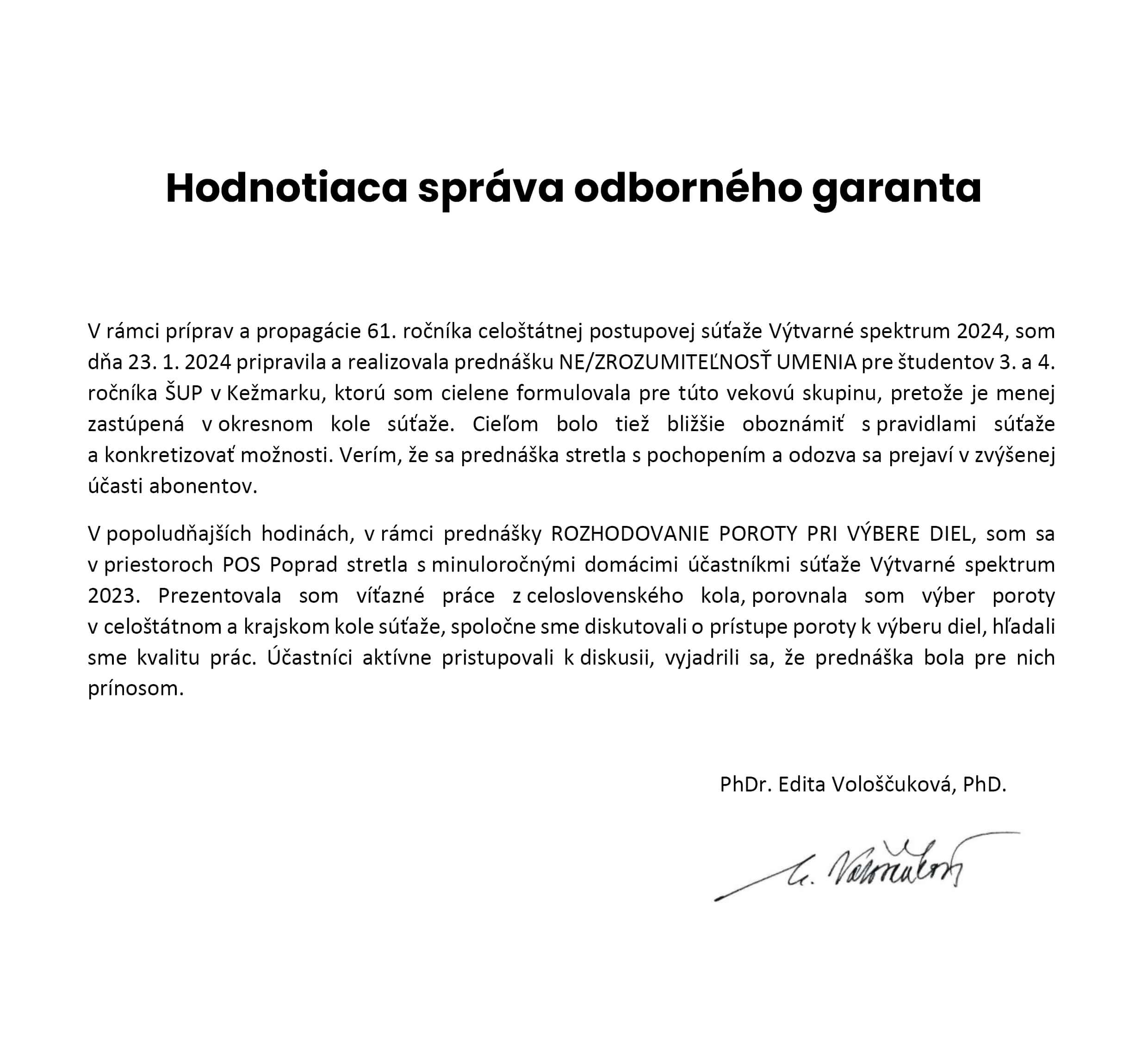 Veľmi nás potešil záujem študentov, ich početná účasť, veríme, že sa nám podarilo u nich ešte viac vzbudiť záujem o výtvarné umenie a podporiť ich kreatívnu tvorivosť, zároveň ich lektorka oboznámila aj s pravidlami postupovej súťaže pre vekovú kategóriu od 15 – 25 rokov: Výtvarné spektrum 2024, ktorej regionálne kolo pre okresy Poprad, Kežmarok, Levoča, Prešov, Sabinov organizuje POS v Poprade.