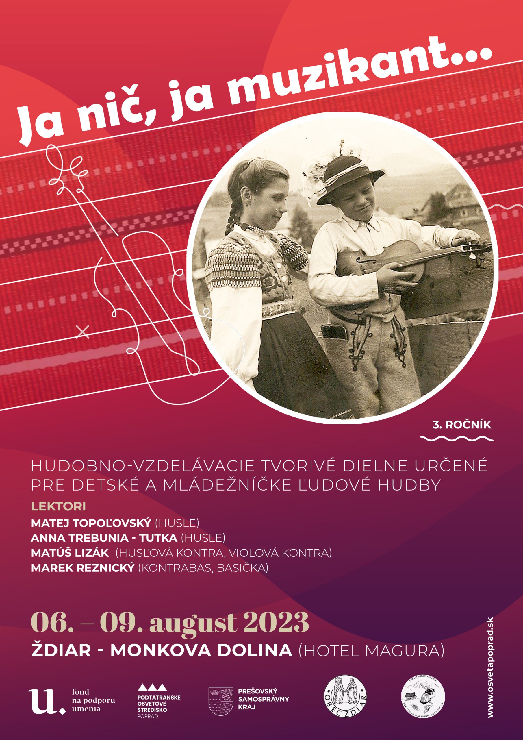 Cieľom tohto projektu je podporiť interpretačné zručnosti mladých muzikantov a osvojenie si štýlovej interpretácie ľudovej hudby. Výučba sa uskutoční oddelene v jednotlivých nástrojových sekciách (husle; husľová / violová kontra; kontrabas / basička) v 3 etapách – doobeda, poobede, večer + spoločne.