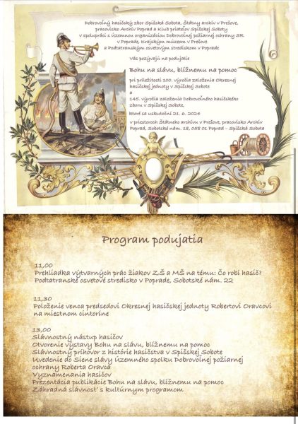 v Prešove, pracovisko Archív Poprad na Sobotskom nám. 18, v Poprade – Spišskej Sobote uskutoční slávnostné podujatie pri príležitosti 100. výročia založenia Okresnej hasičskej jednoty v Spišskej Sobote a 145. výročia založenia Dobrovoľného hasičského zboru