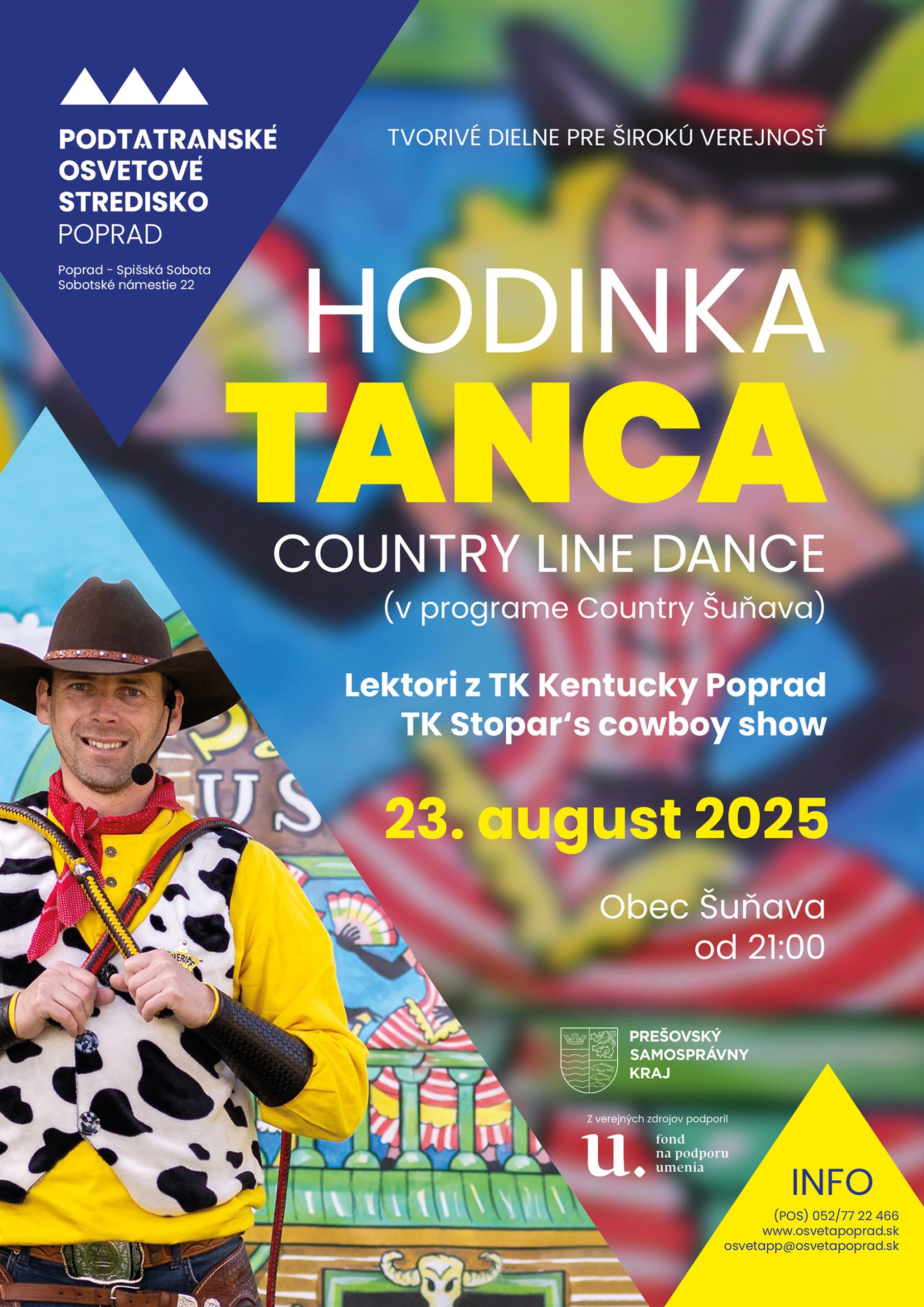 s Country Clubom Šuňava a členmi TK Kentucky Poprad, Stopar´s cowboy schow Lučenec sa naučíme základy “ line dance “ , odvážni a zdatní si môžu vyskúšať aj iné country tanečné kreácie.