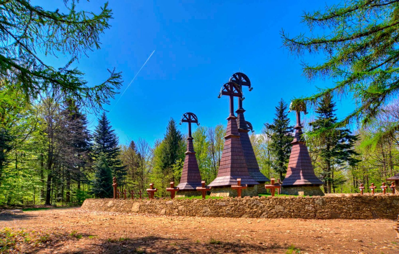 - Na úbočiach a v priesmykoch karpatských hôr postavil D.S. Jurkovič vyše 30 vojenských cintorínov a pomníkov. Hlavným inšpiračným zdrojom bola krajina. Cintoríny zakladal priamo v teréne, aby tak na miestach niekdajších bojov vo formách pamätníkov vyrozprával udalosti vpísané do tohto miesta a pripomenul obete, ktoré si tieto udalosti vyžiadali. Pomníky boli koncipované vždy ako náboženské pietne objekty. Nestaval pomníky hrdinom, staval pomníky padlým. Pod povrchom mnohotvárnych foriem cítiť archetypálne tvary – archaické symboly života a smrti, ktorá znamenala návrat k prírode.