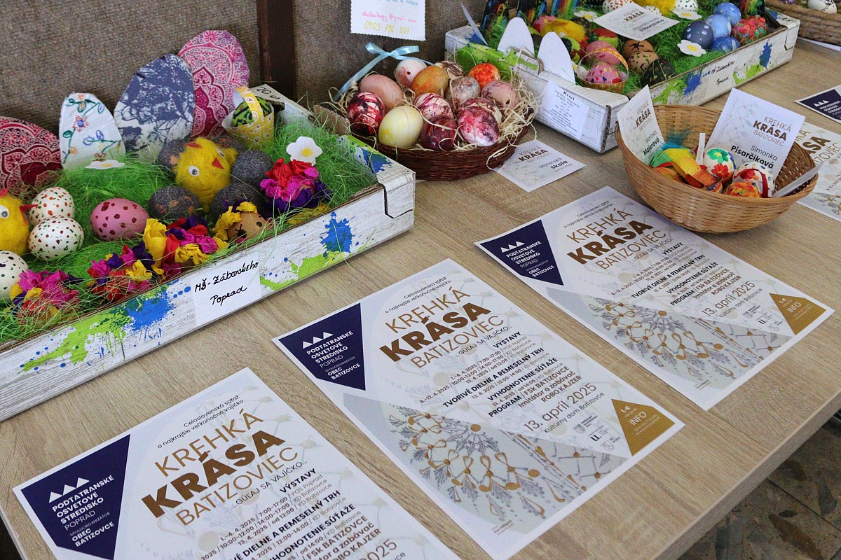 Do výzdoby priestorov Kultúrneho domu sa v rámci výstavy roky zapájajú žiaci z miestnej MŠ, ZŠ, ŠZŠ a klienti z Centra sociálnych služieb Domov Pod Tatrami. Súčasťou podujatia, tvorivých dielní a remeselného trhu bola aj výstava veľkonočných vajíčok, v ktorej sme si uctili aj dámy, ktoré sa venovali tradičnej batizovskej vyškrabávanej technike, ale už nie sú medzi nami. S ich prácou sme si pripomenuli pani Zuzanu Pastrnákovú, Helenu Horevajovú, Annu Zbelovú.