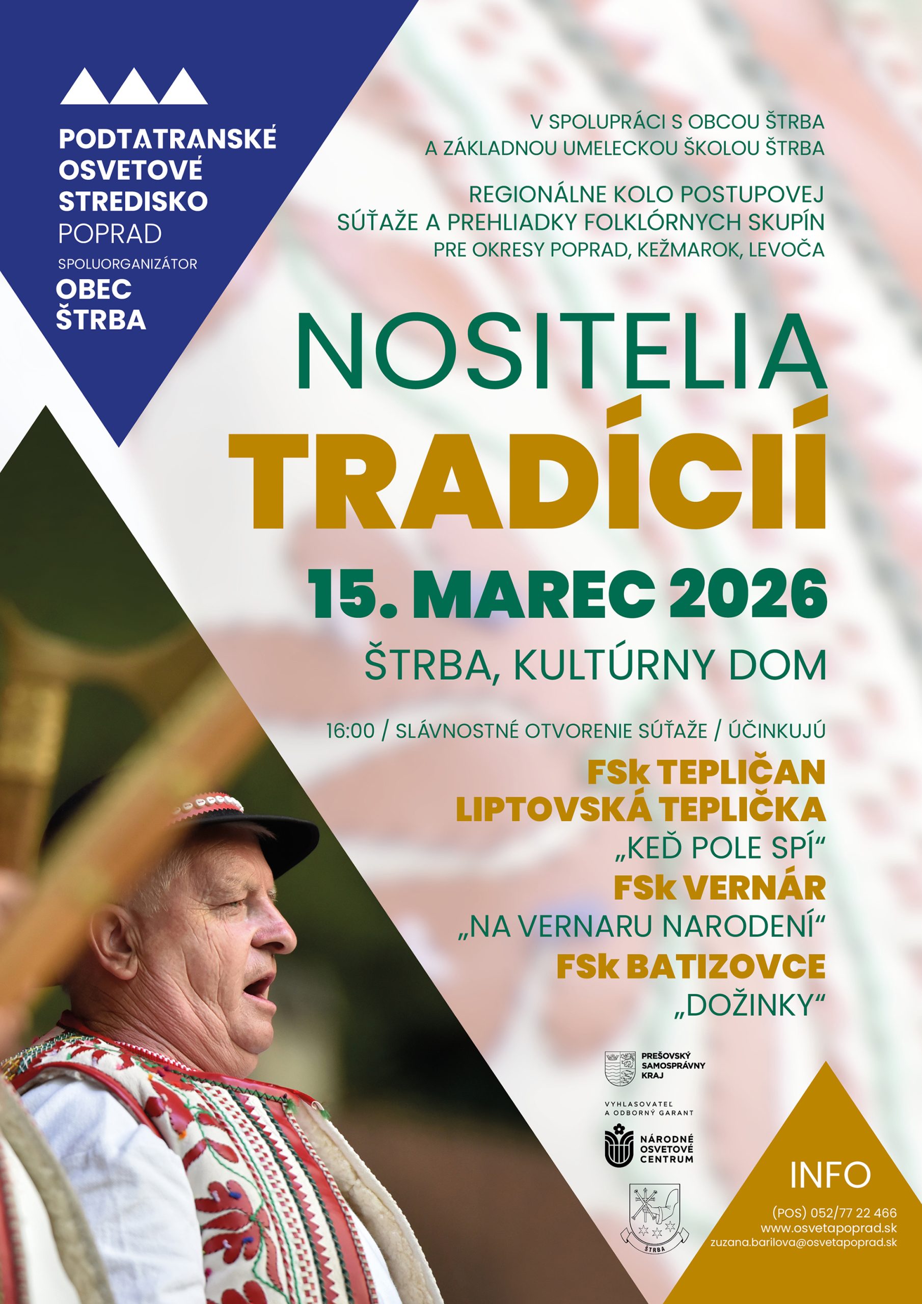 Regionálne kolo postupvej súťaže Nositelia tradícií pre okresy Poprad, Levoča a Kežmarok sa zrealizoval 15.3.2026 v KD Štrba.