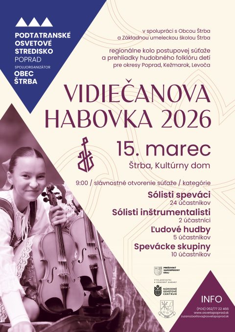 15. marca 2026 sme so spoluorganizátorom Obcou Štrba a ZUŠ Štrba zrealizovali postupovú súťaž hudobného folklóru detí pre okresy Poprad, Kežmarok, Levoča – regionálnu súťaž VIDIEČANOVA HABOVKA 2026.