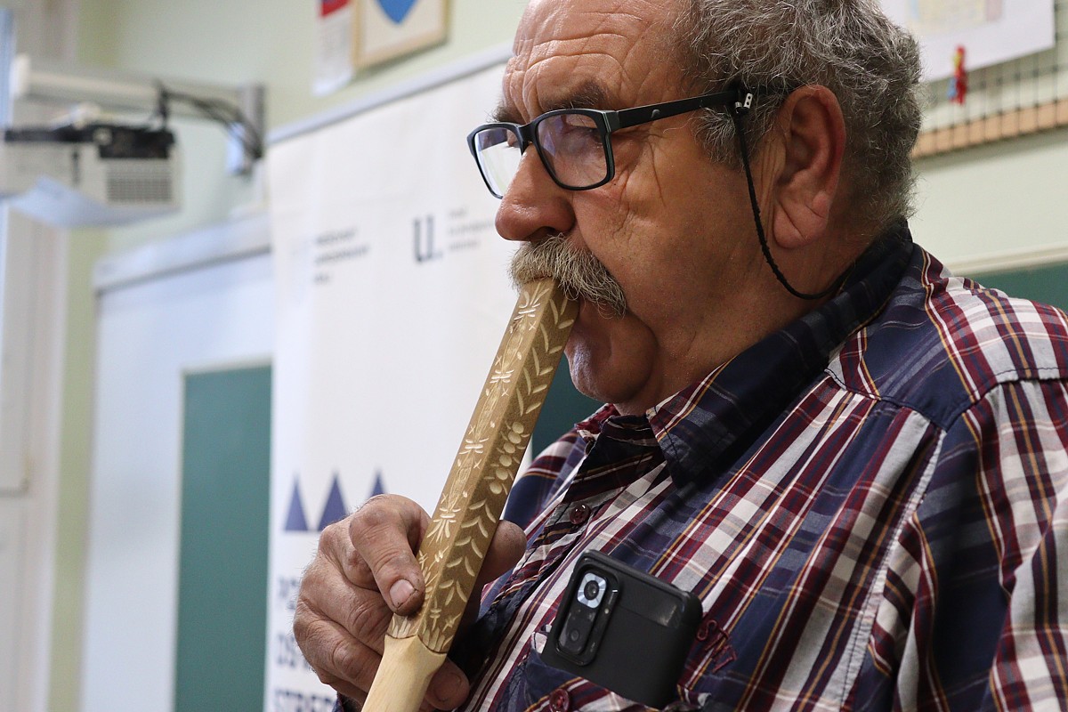 Predstavil malým poslucháčom svoju tvorbu – milovanú čiernu fujaru a koncovú píšťalu, s ktorými začal krátku úvodnú reč a prednášku. Predviedol hru na vlastnoručne vyrobenú fujaru, píšťalu koncovku, aj veľkú varechu 🙂 upravenú na píšťalu.