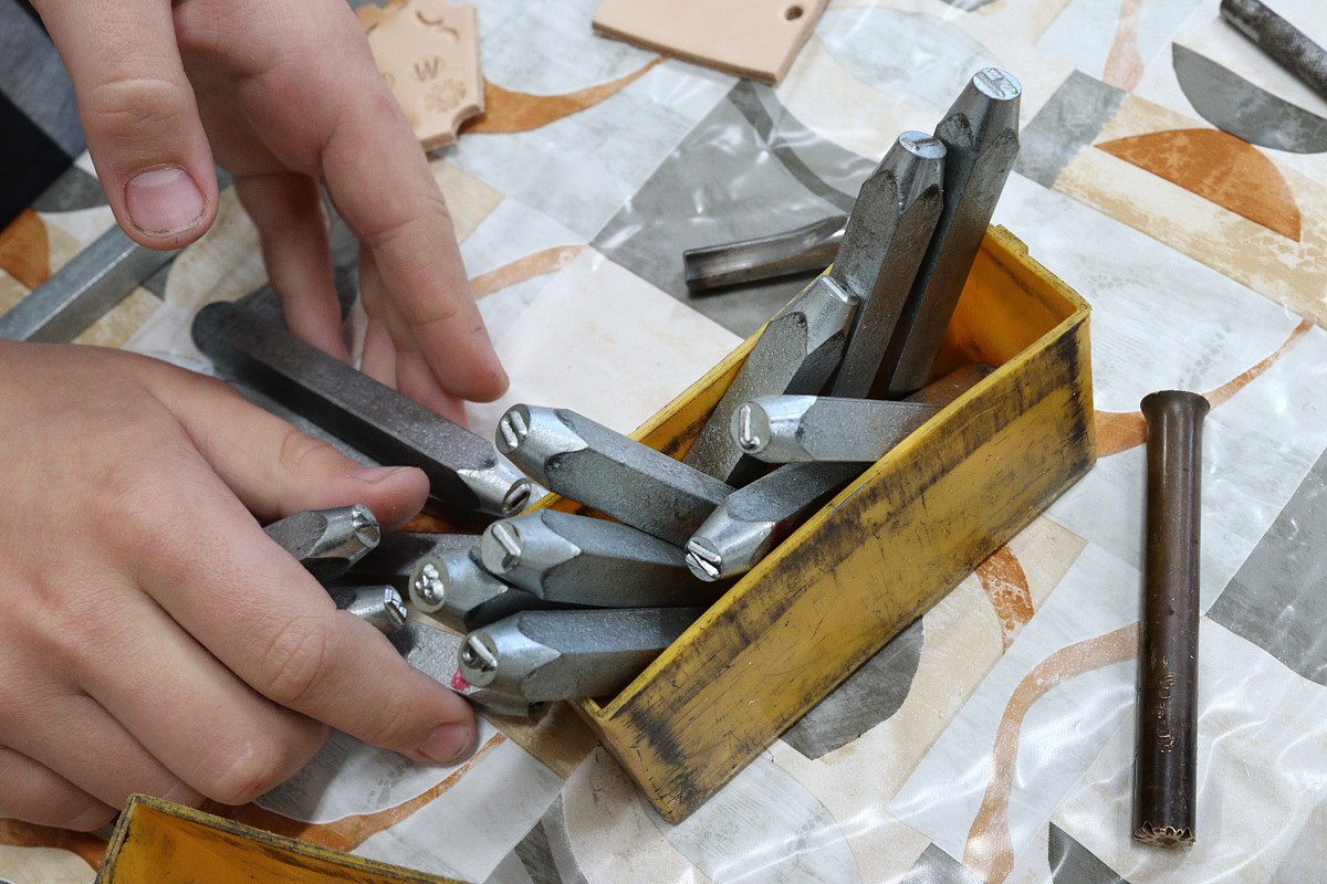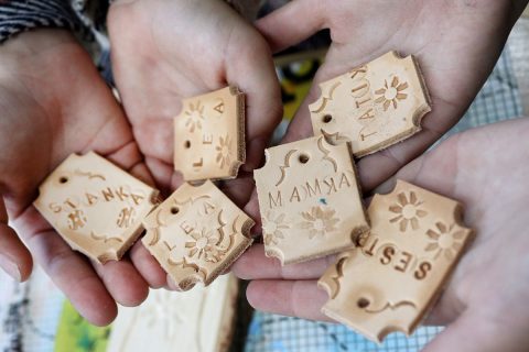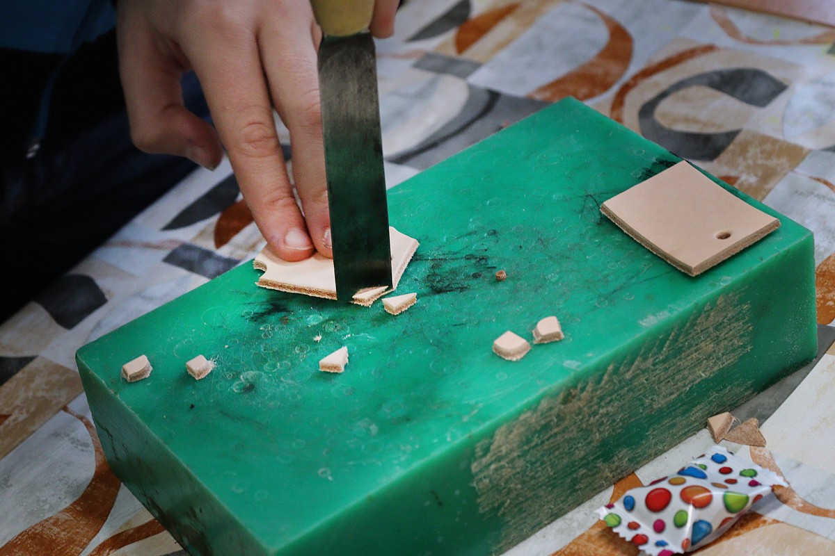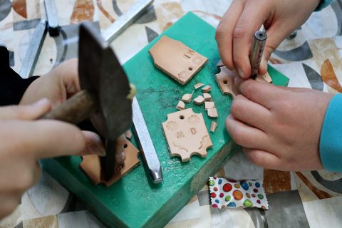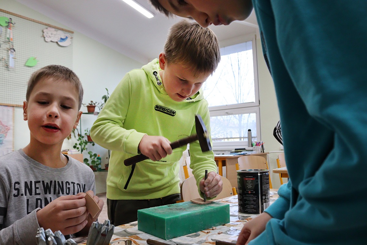 ktorý – ako vždy – prišiel pripravený a priniesol potrebné náradie: drevené dosky na umelecké spracovanie, dláta, vyrezanú kožu na prívesky, kladivá, stolárske svorky, razníky s ornamentami, písmenami, dierovače kože.