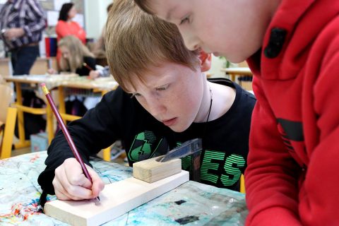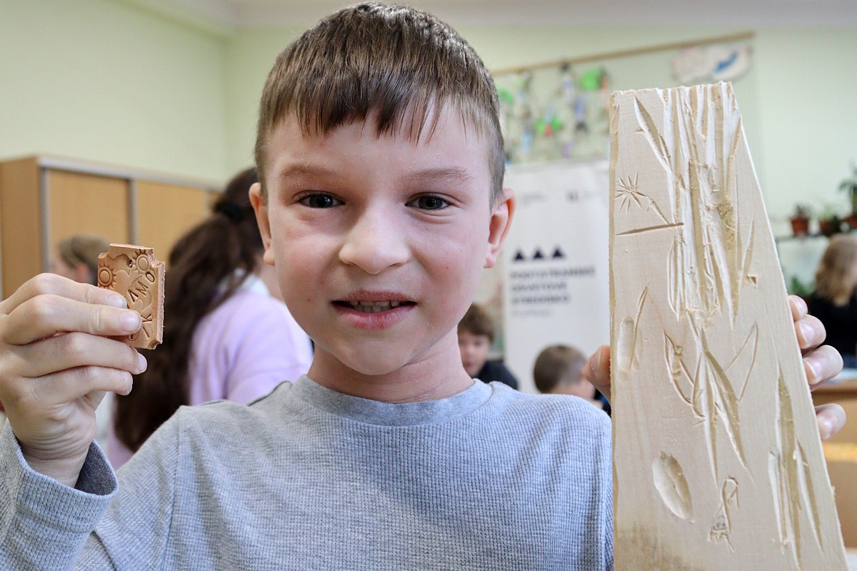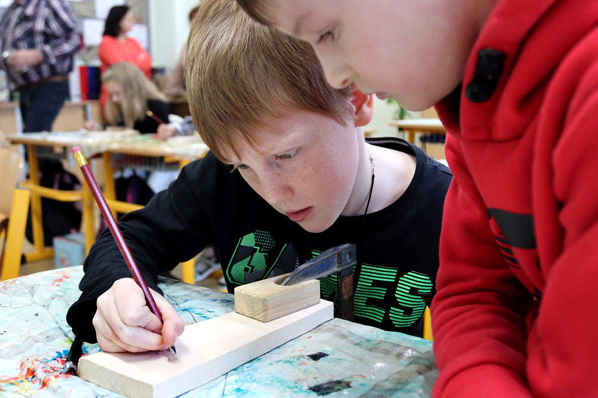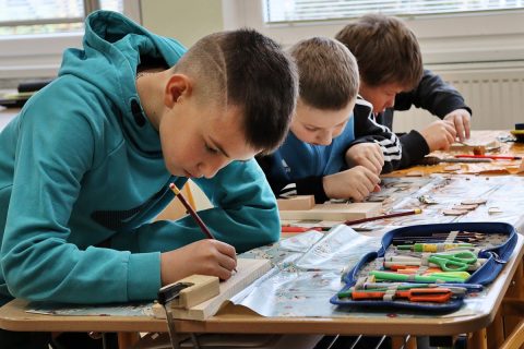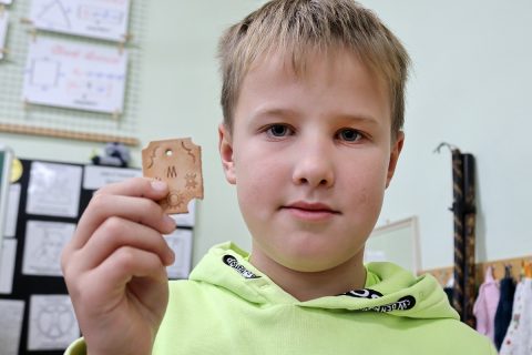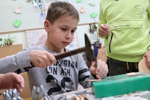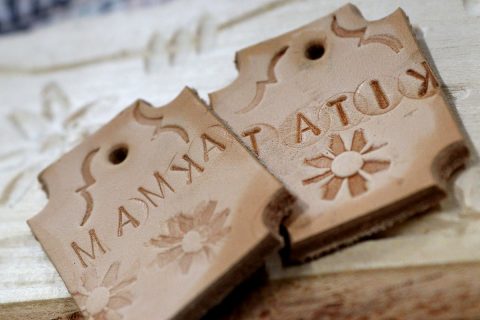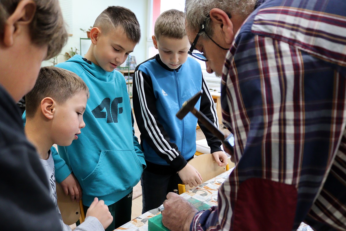 ktorý – ako vždy – prišiel pripravený a priniesol potrebné náradie: drevené dosky na umelecké spracovanie, dláta, vyrezanú kožu na prívesky, kladivá, stolárske svorky, razníky s ornamentami, písmenami, dierovače kože.