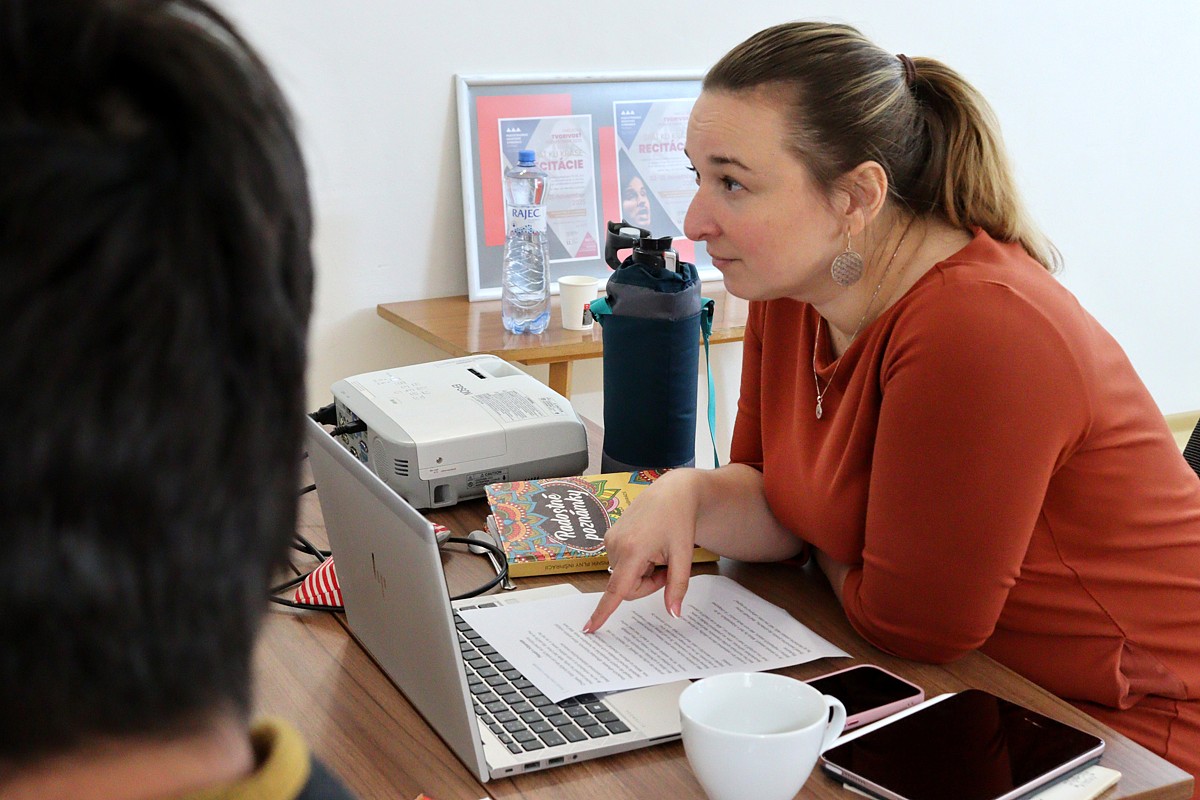 z neho. Na druhý deň sme potom rozoberali text hlbšie na základe dramaturgických otázok a otvárali tému tak, aby sme k nej získali osobnejší prístup. Neskôr sme sa učili pracovať s dôrazom, intonovať, vysvetľovali sme si aký význam má v prednese pauza, neočakávaný moment, stupňovanie, emócie, tempo, rytmus, dynamika a pokúšali sa prebraté témy aplikovať do prednesu. Taktiež sme sa venovali okrajovo mimoslovným prostriedkom. Škoda len, že riaditelia nepúšťajú svojich slovenčinárov na celé dvojdňové školenie, ono totiž má svoj význam, keď tam človek sedí celé dva dni. Myslím si, že ak pedagóg neabsolvuje celé školenie, neodnesie si z neho plnú skúsenosť.