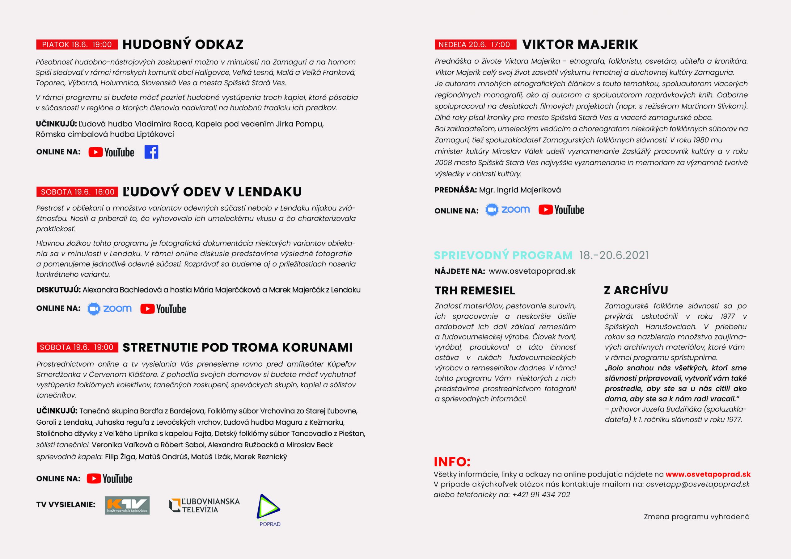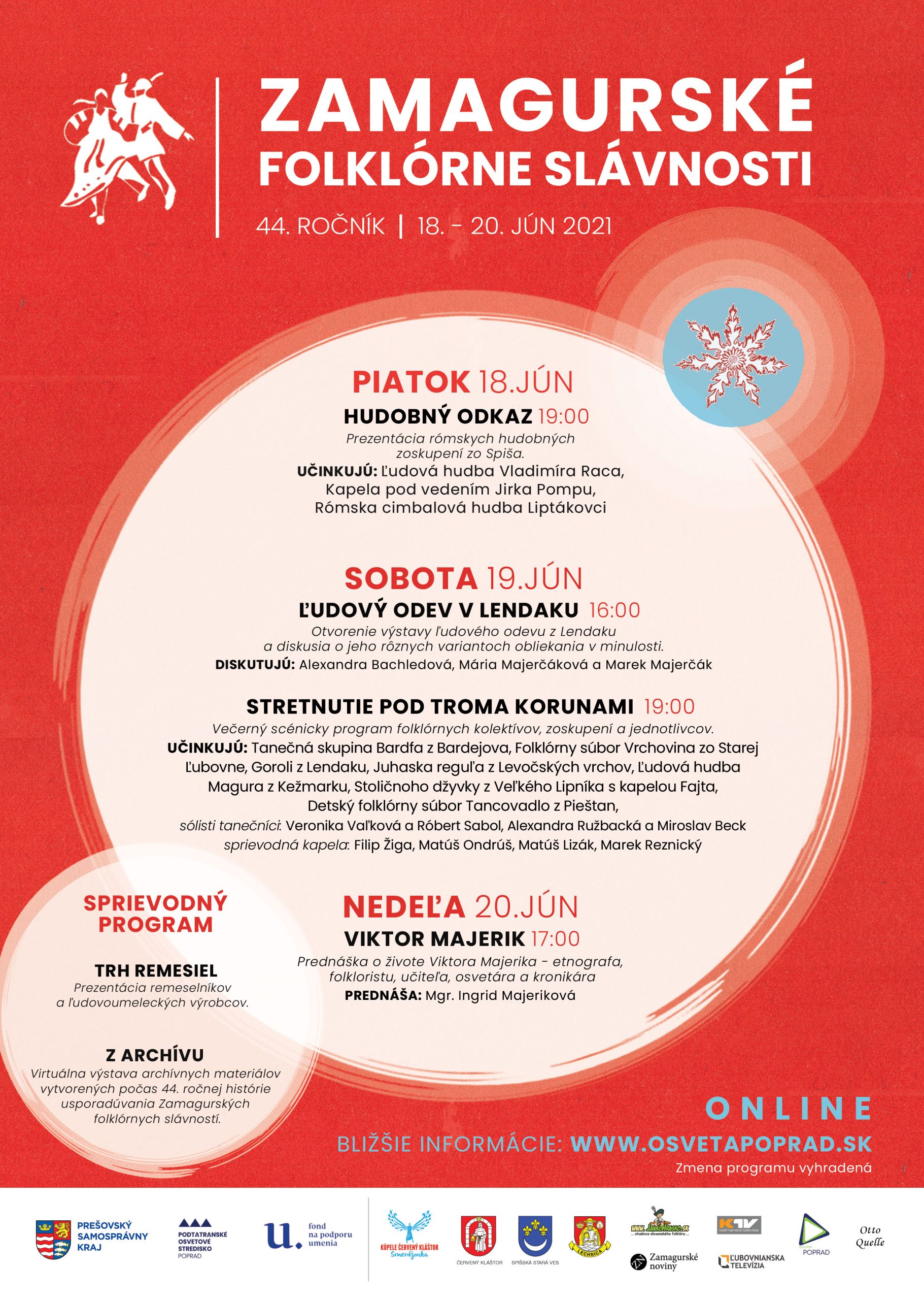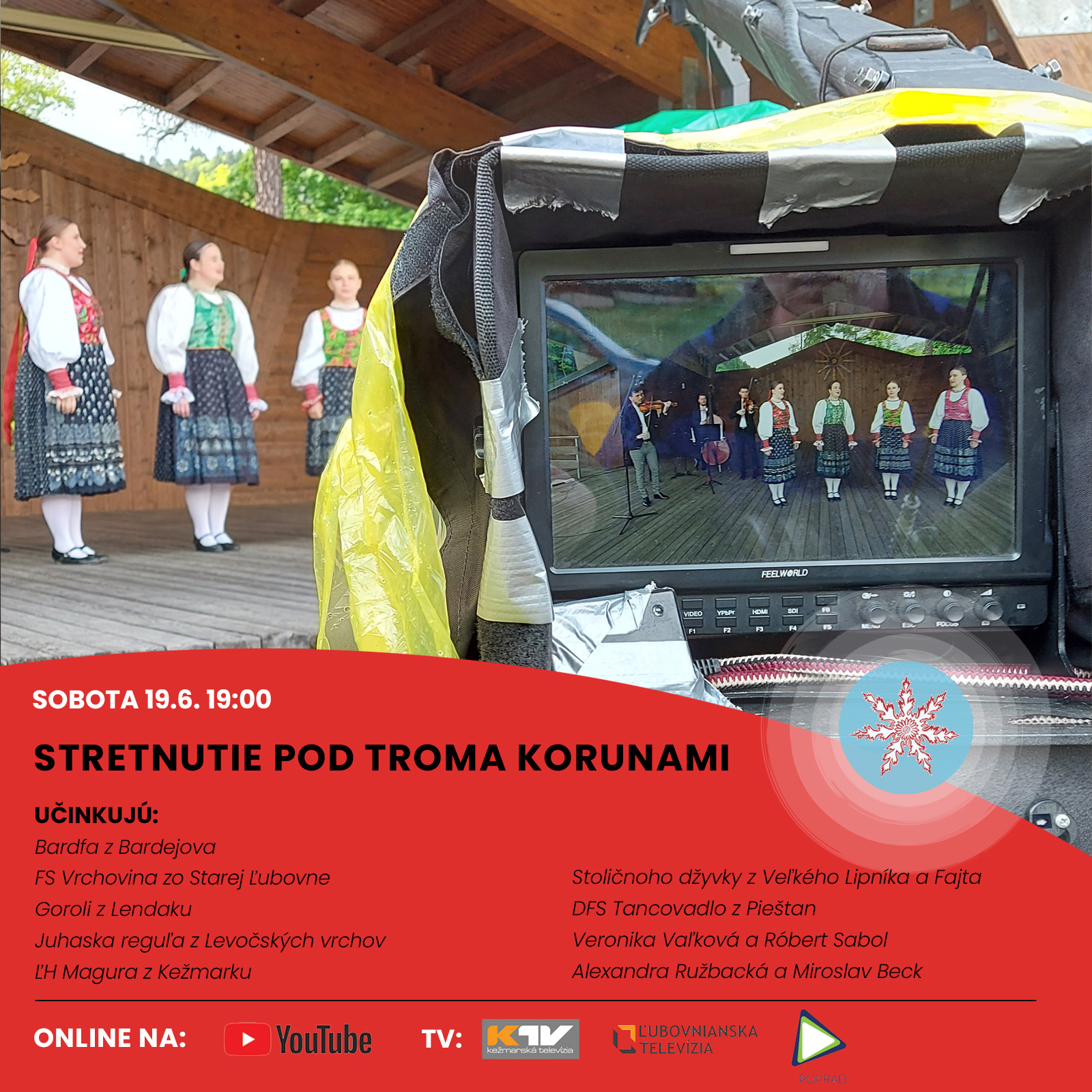 Prostredníctvom online a tv vysielania sme Vás preniesli rovno pred amfiteáter Kúpeľov Smerdžonka v Červenom Kláštore. Z pohodlia svojich domovov ste si mohli vychutnať vystúpenia folklórnych kolektívov, tanečných zoskupení, speváckych skupín, kapiel a sólistov tanečníkov.