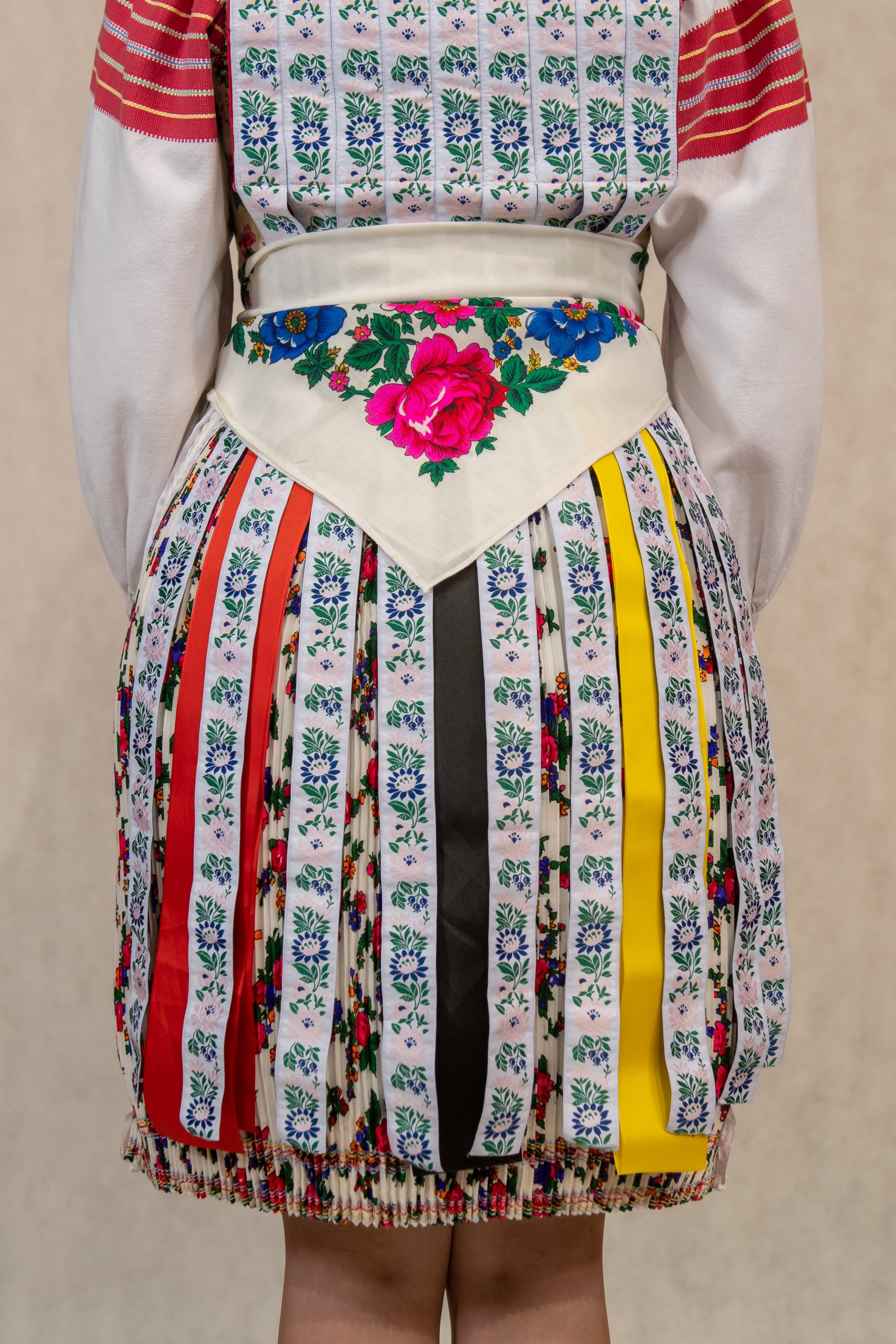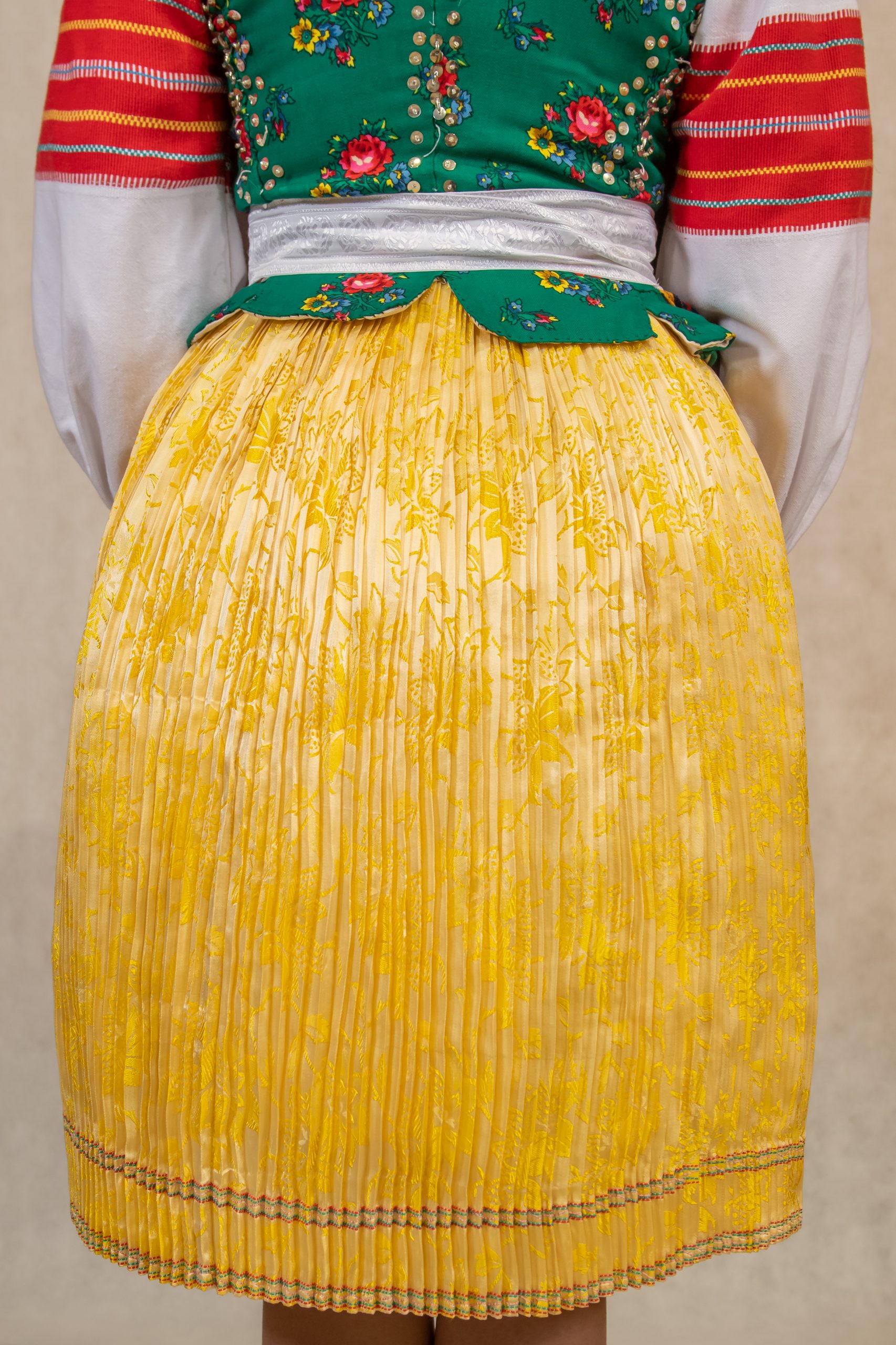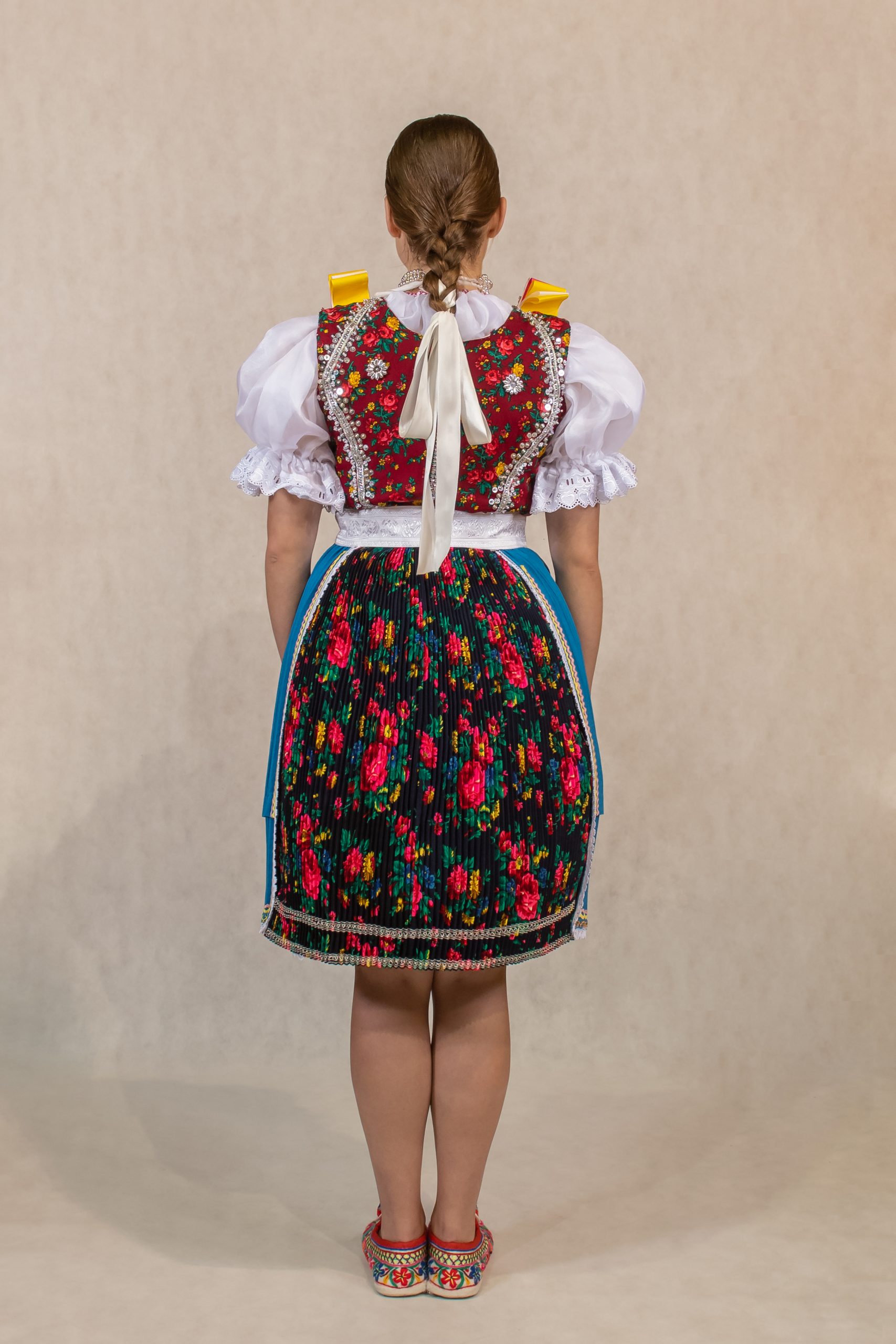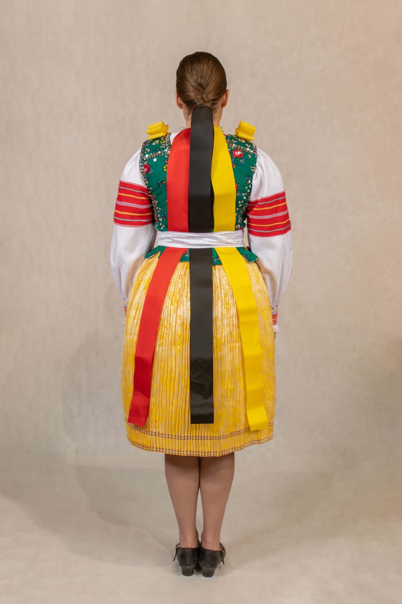 perly, poska, ľajbik zdobený ovieskami, kydeľ – hrube z ľaľijami, pantľiky, fartuch, topánočky