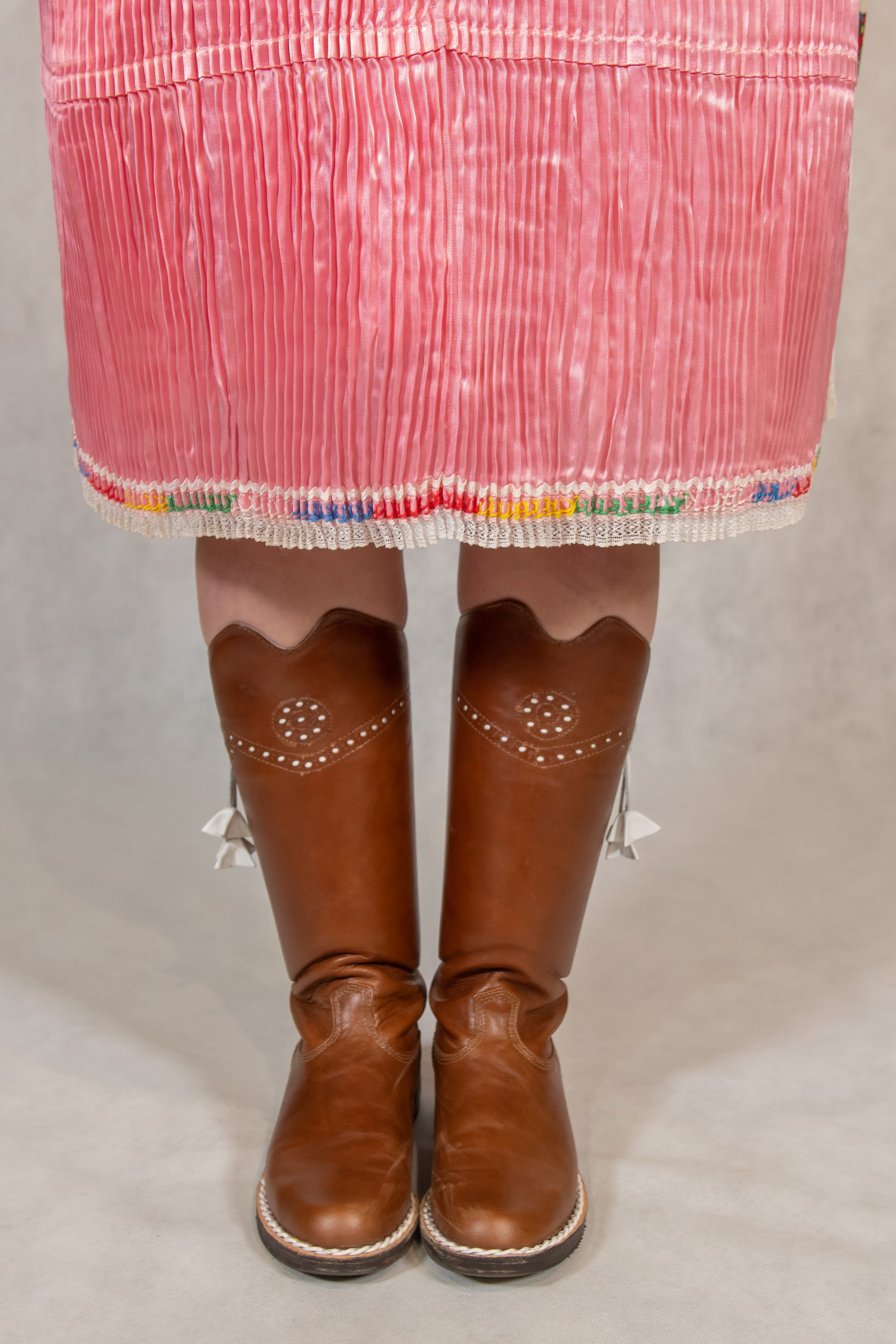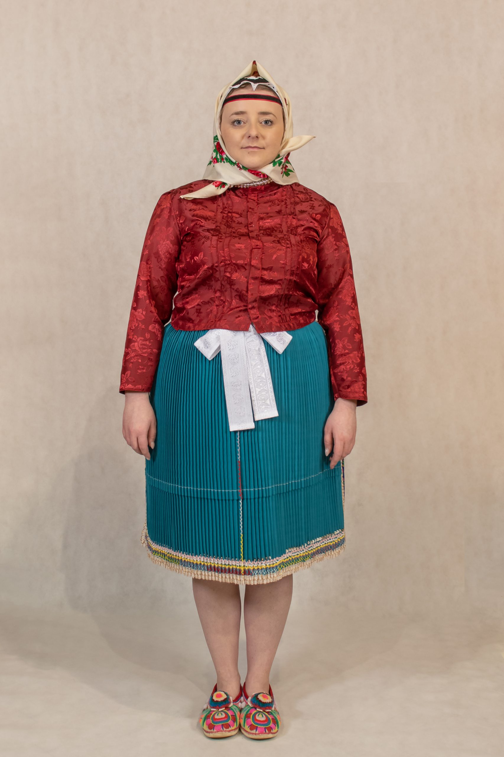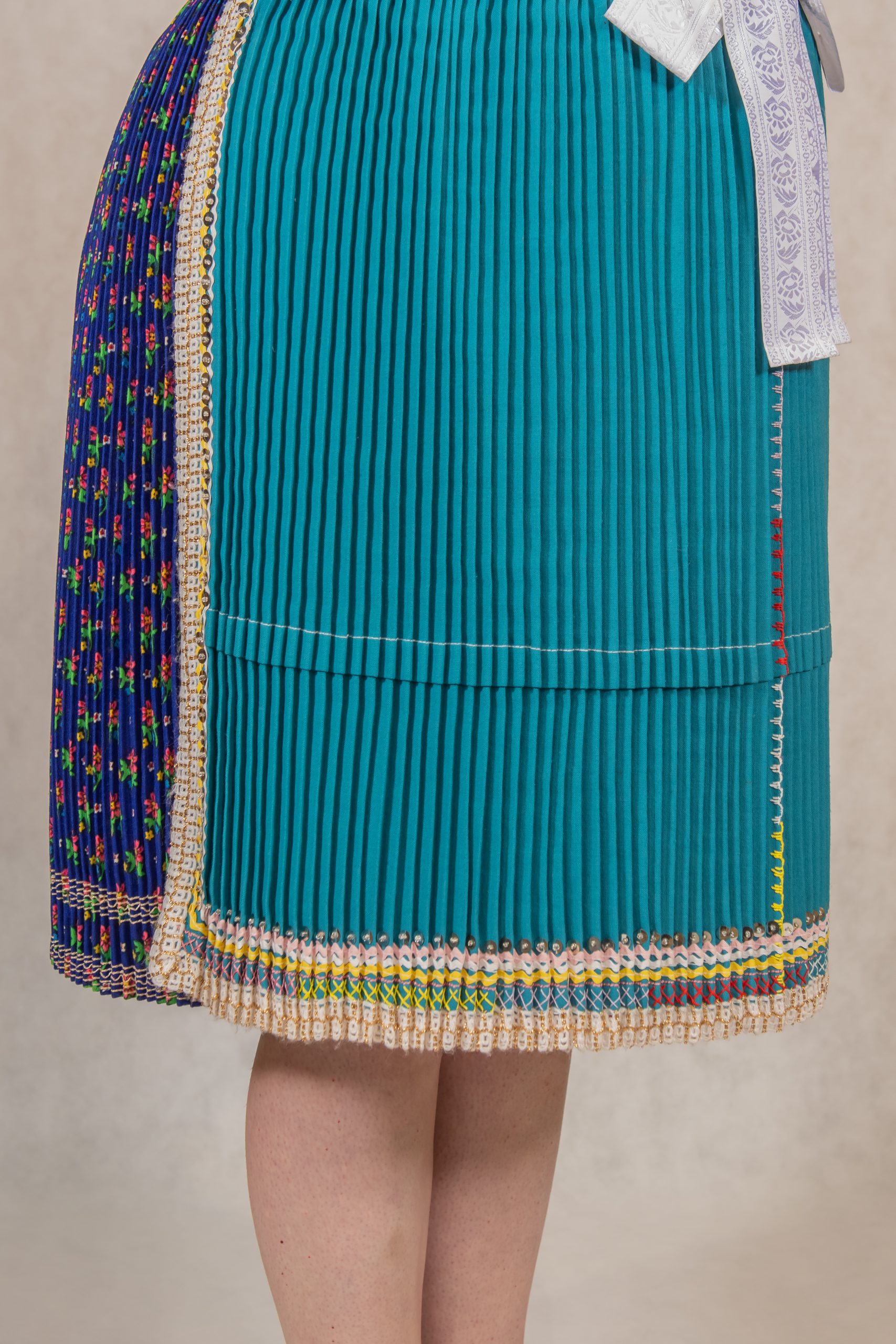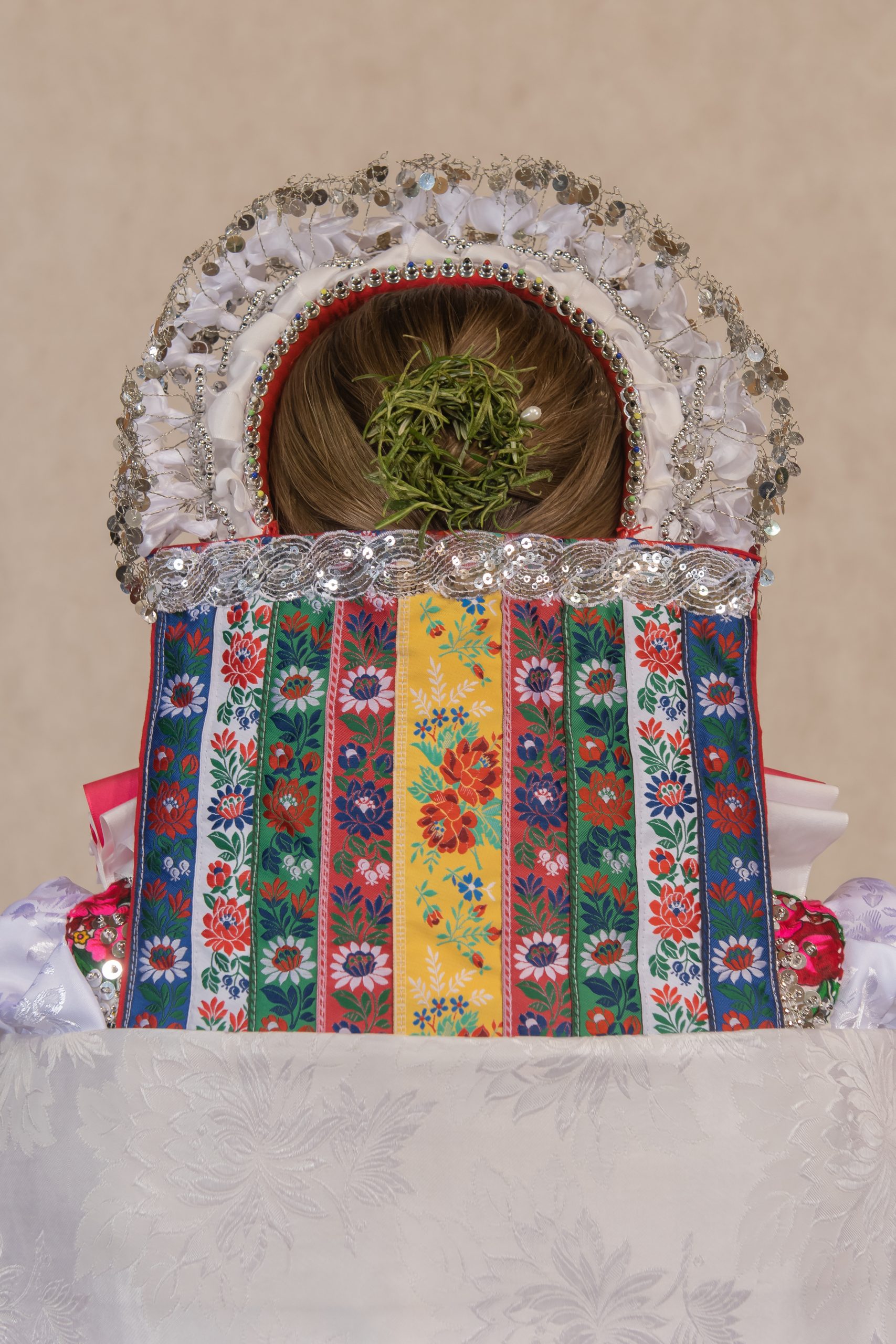 perly, poska, ľajbik zdobený ovieskami, kydeľ – hrube z ľaľijami, pantľiky, fartuch, topánočky