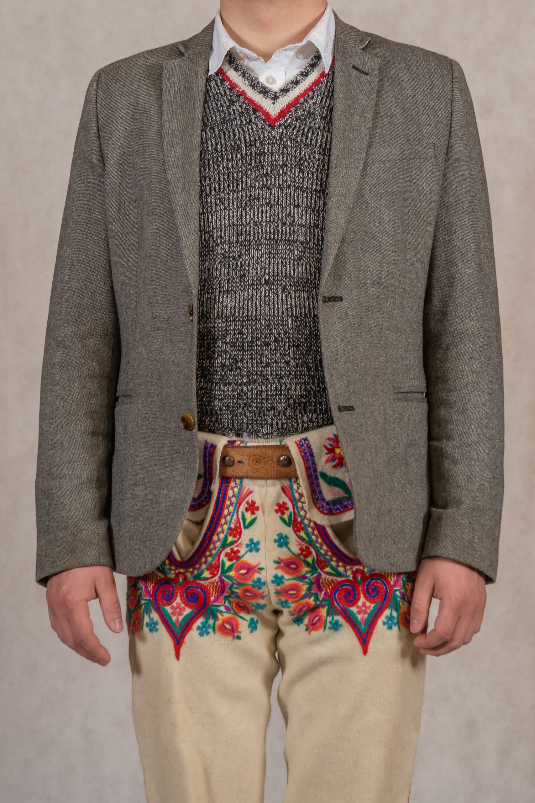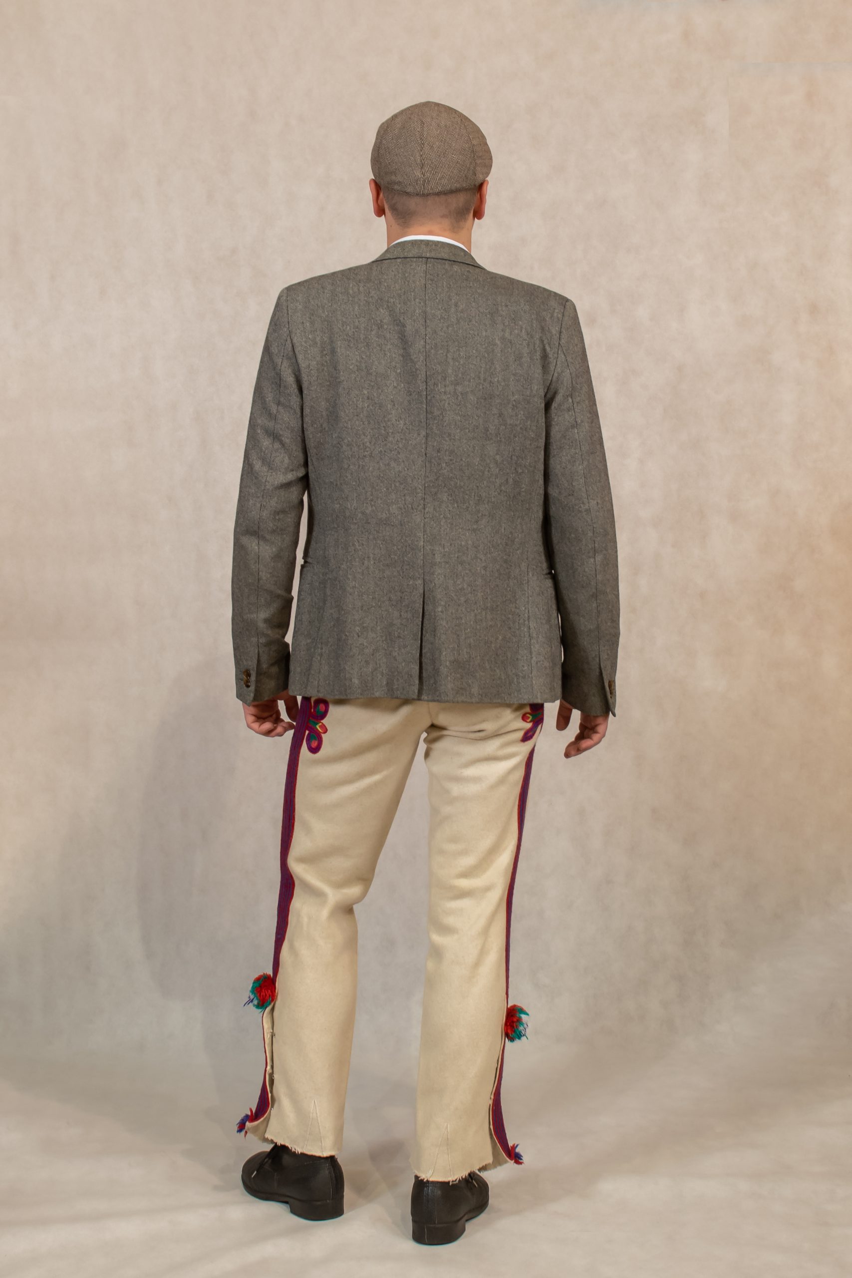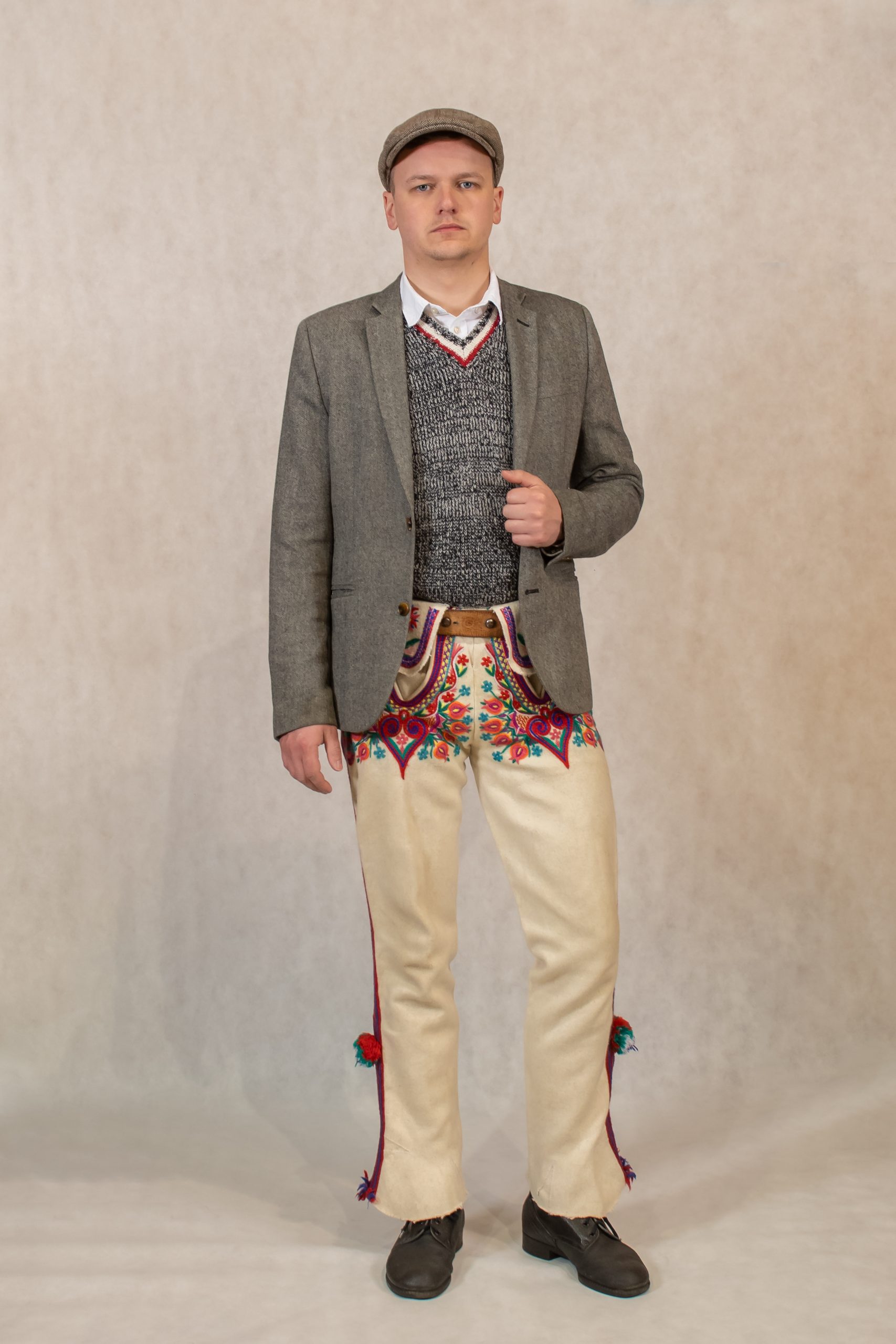 baretka, konfekčná košeľa, vlnený sveter, sako – gierok, pôrtky, topánky